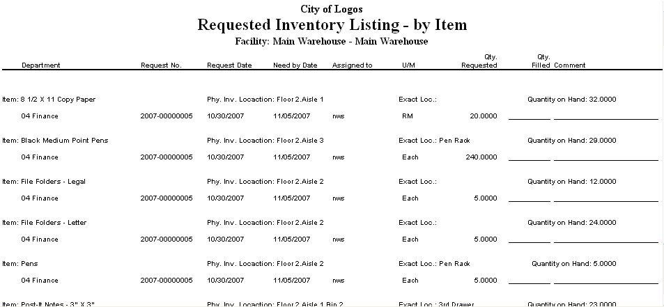 - The New Page per Ordercheck box, when selected, tells system to start each order on a new page. This would be recommended if the list is being printed for multiple departments/customer or for multiple assigned users.