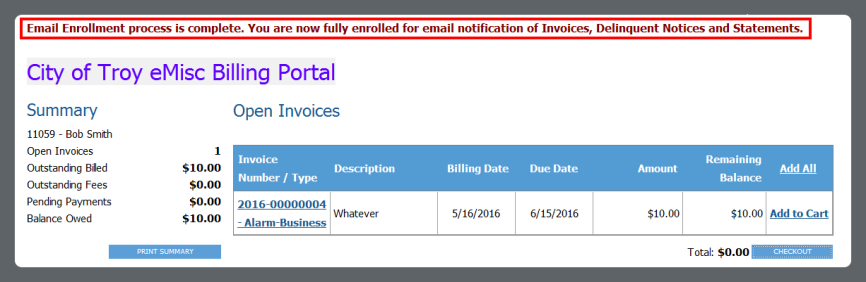 Partially Enrolled and the customer will be automatically sent a “Welcome/Confirmation” email message. The message will include a link that the user must click to confirm and complete enrollment. When the link is clicked, the login page of the eMiscellaneous Billing logon page will open. When the user logs in, the Summary page will display a message informing the customer that they have been successfully enrolled. The Account Info and Email Enrollment tabs will both show an Enrollment Status of Fully Enrolled.