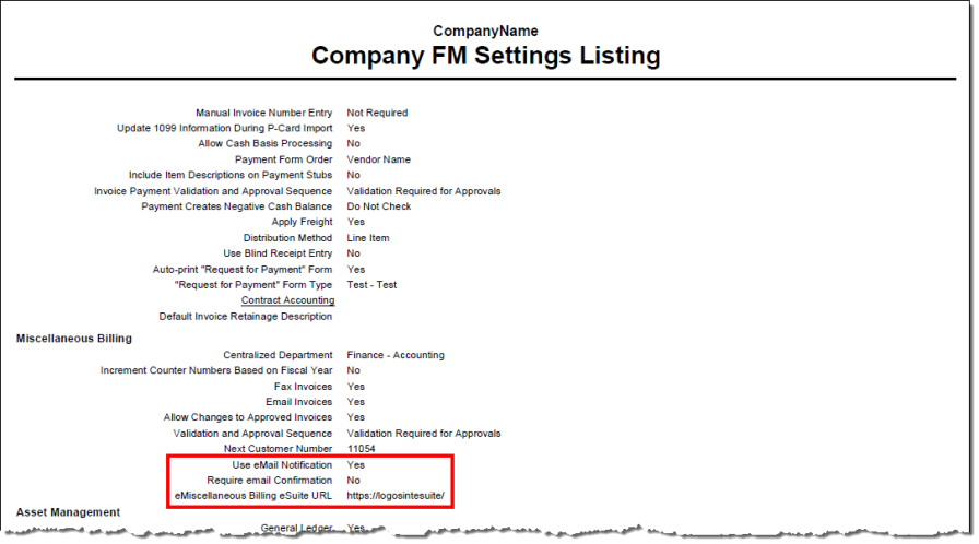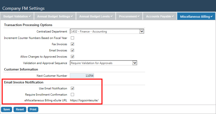 Note: To use this functionality, you must be licensed for the eSuite eMiscellaneous Billing module. Otherwise, the Email Invoice Notification settings will be disabled.