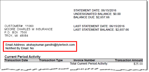 Also, if you have selected to print customer statements, the mail merge form (Echo form) includes the Email Address and Notified by Email fields. The former indicates the email address associated with a customer’s primary contract, and the latter whether or not the customer was notified of the invoice’s availability via email. The Notified by Email field is based on the primary contact’s email enrollment status. If the contact’s status is Not Enrolled or Partially Enrolled, the Notified by Email field will read No. If the contact is Fully Enrolled, then this field will read Yes.