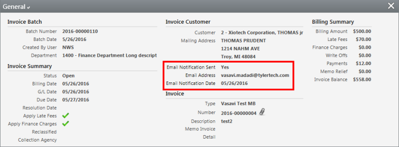 When you execute a Billings by Invoice Type inquiry and select an invoice, you can view email notification enrollment information on the General tab of the invoice inquiry pop-up page including the following fields: Email Notification Sent, Email Address, and Email Notification Date. These fields are included for informational purposes only and cannot here be edited.