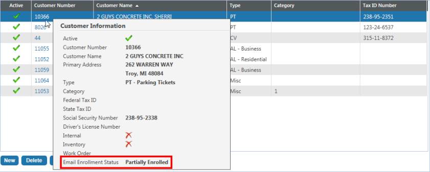 In the search results grid, hovering over a customer number displays the Customer Information pop-up. The Email Enrollment Status field in the pop-up window indicates the customer’s current enrollment status.