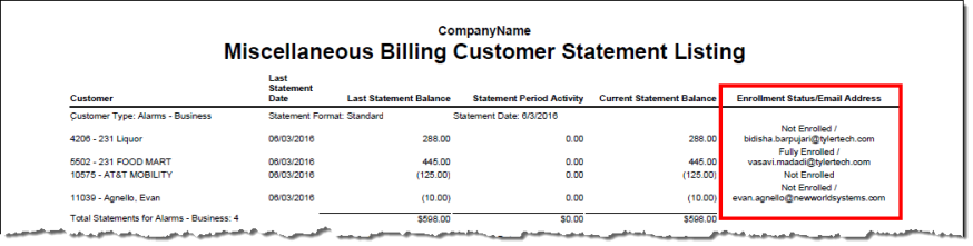 The printed Miscellaneous Billing Customer Statement Listing includes the Enrollment Status/Email Address column. This column displays the email address and enrollment status (i.e., not Enrolled, Partially Enrolled, or Fully Enrolled) of every applicable customer in the listing. Email information is provided for primary contacts only; email information for non-primary contacts does not appear in the report.