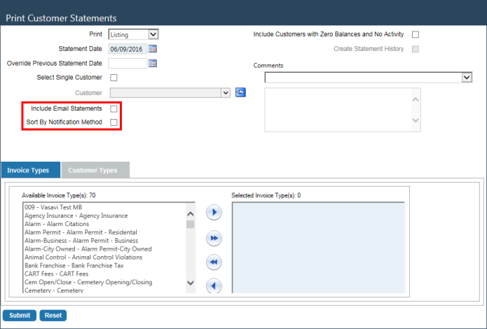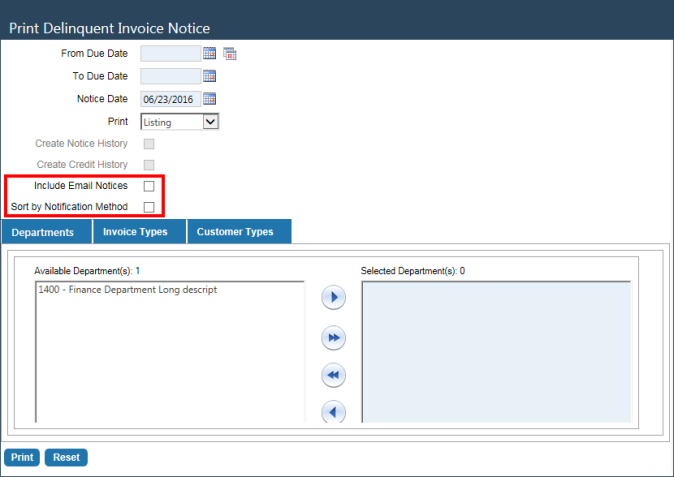 Also, the Print Delinquent Invoice Notice page includes the Include Email Notices and Sort by Notification Method check boxes. If the Include Email Notices check box is selected when invoices are submitted for printing, notices for customers who are fully enrolled for email notification will be included in the print queue. If this check box is cleared, notices for these customers will NOT be included in the print queue.