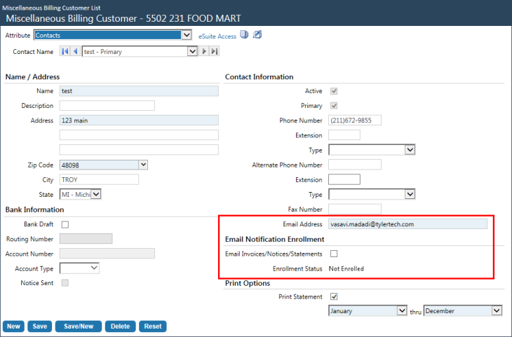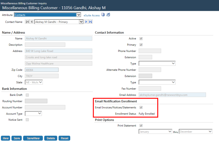 Note: If the Email Invoices/Notices/ Statements check box is ever cleared and saved after having been selected and saved, the customer’s Enrollment Status value will be changed to Not Enrolled and they will be sent an email message informing them that they have been unenrolled. Likewise, if the Email Address is changed and the change is saved, a “Welcome/Confirmation” email message will be sent to the updated email address.