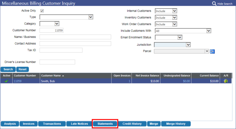 Financial Management > Inquiries > Miscellaneous Billing > Customers > Select a customer > Statements button
