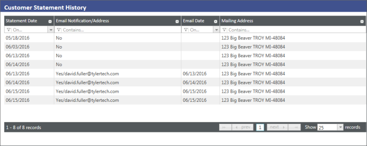 The Email Notification/Address column provides two things: 1) an indication of whether or not email notification was sent to the customer for a specific statement, and 2) if a notification was sent, the email address to which it was sent. If a statement was not sent via email, this field will read “No” and the address portion of the field will be blank.