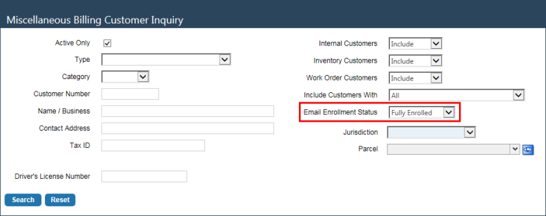 The Email Enrollment Status drop-down list on the Miscellaneous Billing Customer Inquiry page allows users to search for Miscellaneous Billing customers based on their email enrollment status. The drop-down list includes the following options: Not Enrolled, Partially Enrolled, and Fully Enrolled. Leaving this field blank, the field’s default value, is also an option.