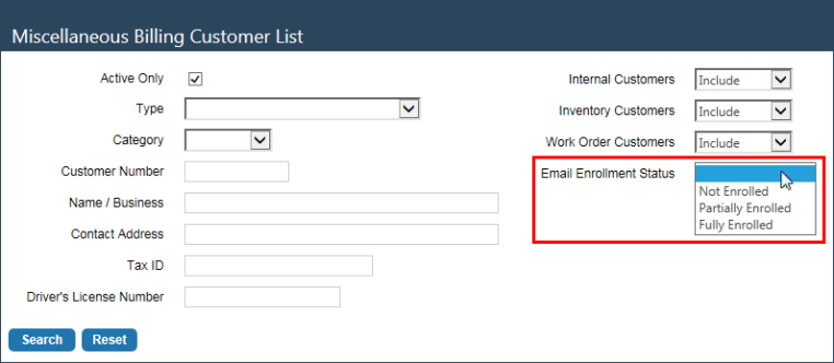 The Email Enrollment Status drop-down list on the Miscellaneous Billing Customer List page allows users to search for customers based on their email enrollment status. Drop-down list options include Not Enrolled, Partially Enrolled, and Fully Enrolled. Leaving the field blank is also an option.