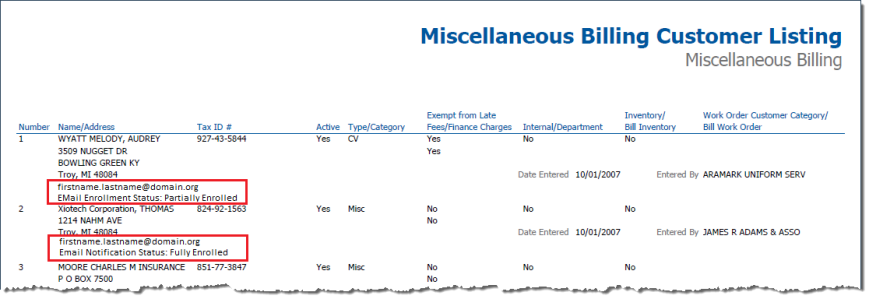 On the printed report, the customer’s email address and email enrollment status appears in the Name/Address column (see screen shot below). Individual email addresses are pulled from the Contact attribute of each customer’s Miscellaneous Billing Customer page. The Email Enrollment Status is always that of the customer’s primary contact. All non-primary contacts will have a status of Not Enrolled, whether email addresses are provided or not.