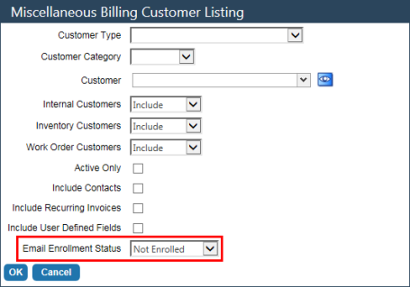 The Miscellaneous Billing Customer Listing window includes the Email Enrollment Status field. This field allows users to limit the listing to customers with a specific email enrollment status, such as Not Enrolled, Partially Enrolled, or Fully Enrolled. The default setting for this field is blank. If left blank, customer email enrollment status will not impact print results.