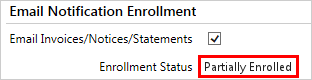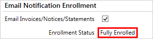 The Enrollment Status field cannot be directly modified. If customer enrollment confirmation is NOT required, then the first time you select the Email Invoices/Notices/Statements check box and save your change, the Enrollment Status field will be updated to Fully Enrolled.