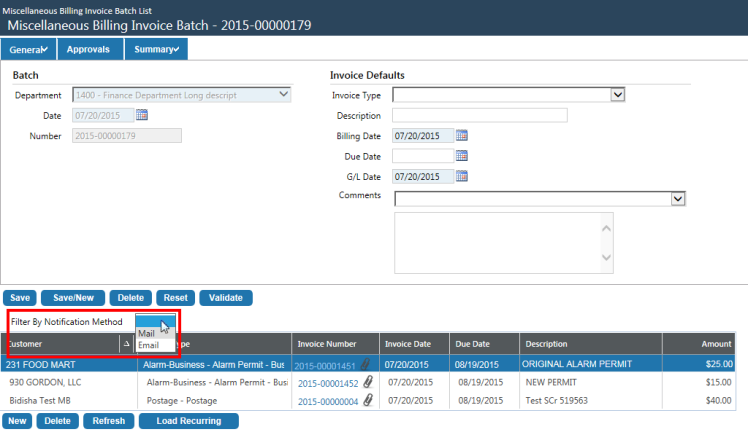 Miscellaneous Billing > Billing Invoice Batches > Select a batch > General tab