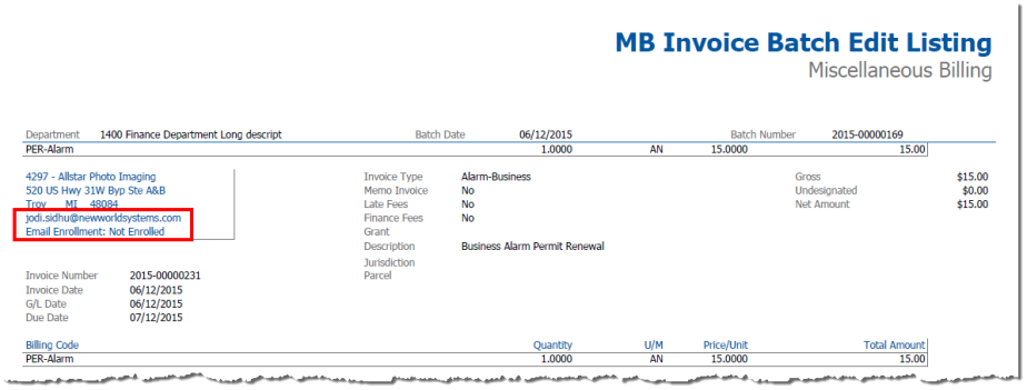 Email enrollment information is included in the MB Invoice Batch Edit Listing. If a customer’s email address has been entered in the Contact section of the Miscellaneous Billing Customer page, it will be included under the customer’s physical address in the MB Invoice Batch Edit Listing, along with their email enrollment status.
