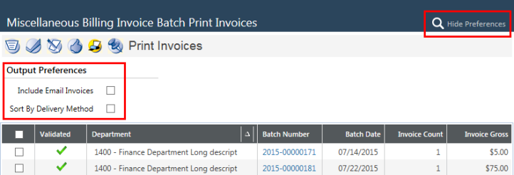 Printing settings related to Email enrollment are included on the Miscellaneous Billing Invoice Batch Print Invoices page. Clicking the Show Preferences/Hide Preferences toggle will show or hide the settings respectively.