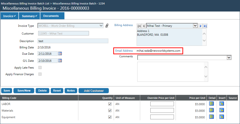 For user reference, the Email Address field is included on the Miscellaneous Billing Invoice page. This field is visible only when the primary contact associated with the invoice is selected from the Billing Address field. It displays the primary contact’s email address as defined via the Contact attribute of the Miscellaneous Billing Customer page (see Back Office Customer Setup).