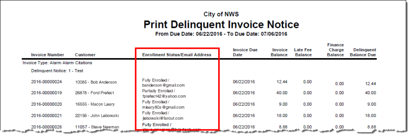 The printed Delinquent Invoice Notice listing includes the Enrollment Status/Email Address column. This column displays a customer’s email address and enrollment status (i.e., Not Enrolled, Partially Enrolled, or Fully Enrolled). This information is only provided for primary contacts. It is blank for non-primary contacts and for contacts whose email information is not known.