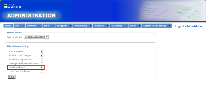 - Click Save. Residents who have an eMiscellaneous Billing account will now be able to enroll for email notifications.