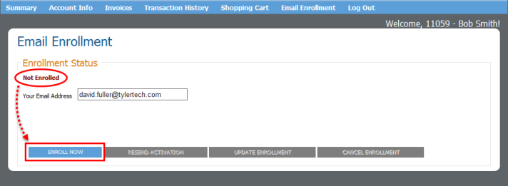 Fully Enrolled, a “Welcome” email message will be automatically sent to the customer’s specified email address to inform them that they have been successfully enrolled for email notification, and they will begin receiving invoice notifications, delinquency notices, and customer statements. -