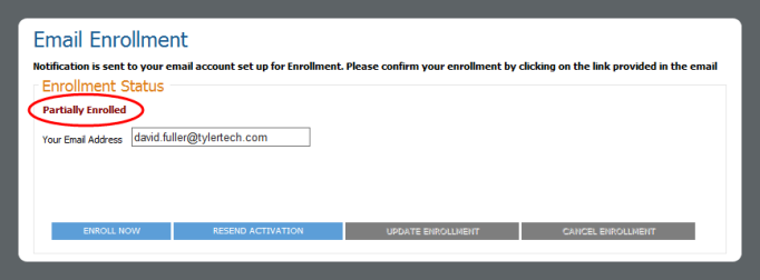 Note: Users who do not complete this step will remain Partially Enrolled and will not be able to receive email notifications. Only fully enrolled users can receive notices via email.