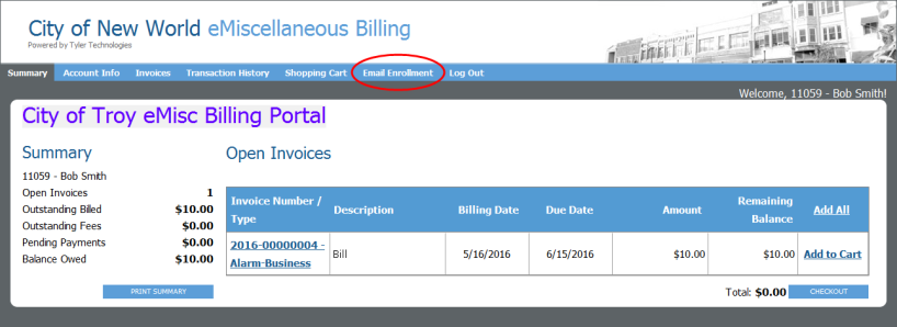 As stated above, customers can be enrolled for email notification in one of two ways: 1) Back office Miscellaneous Billing users can enroll customers on an individual basis, and 2) once your eSuite administrator enables the feature in eMiscellaneous Billing, customers can self-enroll in eMiscellaneous Billing.