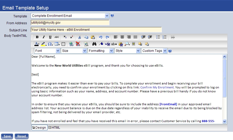 The Custom Tags field contains links that, when added to the template message, will populate with values from the database for the account that is receiving the emails. The options in this field are populated based on values in the eBills section of the UM Settings page. The links allow you to create a more personalized message to send to your customers. To add the link information, simply type the link, including the square brackets, where you want it to appear. Use normal spacing and punctuation as if it were a regular word in your message. The Activate and View Bill messages must contain tags.