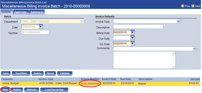 - Click New to create a new invoice or click the Invoice Number hyperlink in the invoice list to edit an existing invoice.