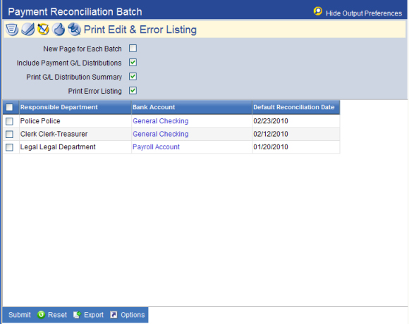 - Print Error Listing – the Payment Reconciliation Batch Error Listing for the selected batches is sent to myReports.