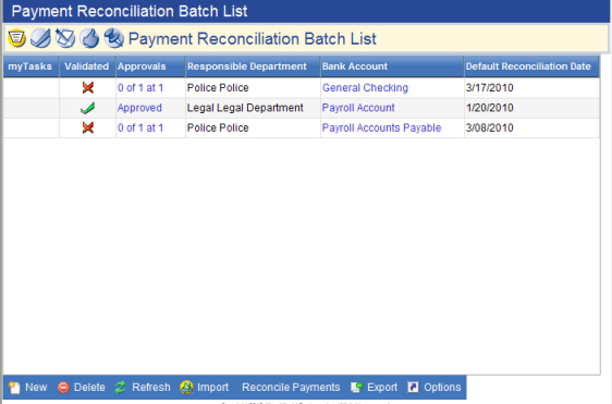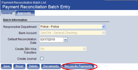 Payment Reconciliation Batch Processing allows authorized users to create payment reconciliation batches. On the Payment Reconciliation page, authorized users can reconcile payments.