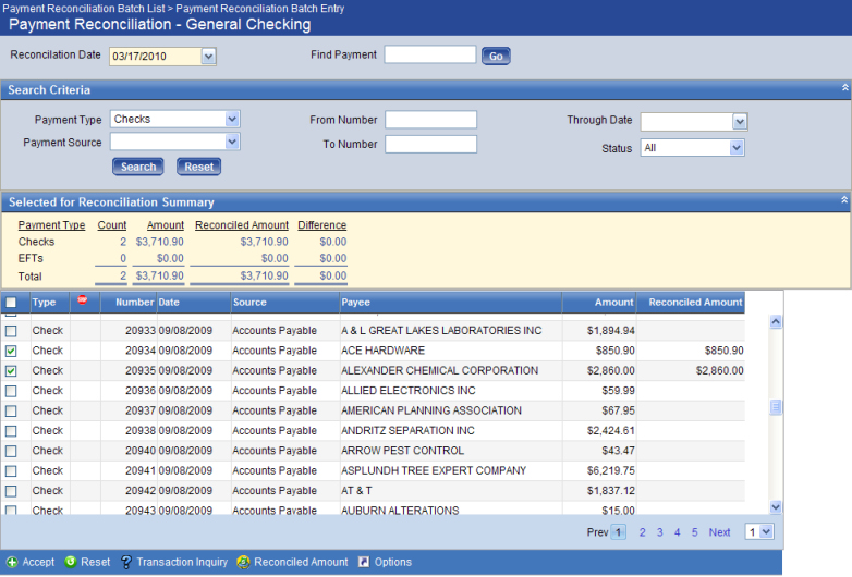 To reconcile payments, select a check box next to the payments in the list. Use the Next button in the bottom right of the list to navigate to additional pages. After you select all of the payments you want to reconcile, click Accept. The amounts in the Selected for Reconciliation Summary section are updated to reflect the payments selected.