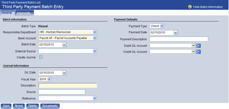 The Third Party Payment Batch Entry page allows authorized users to create payment batches from sources generated outside the standard flow of the New World ERP application.