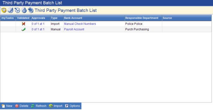 Third Party Payment Batch List page allows authorized users to view payment batches from sources generated outside the standard flow of the New World ERP application. The workflow supports two basic types of payment batches: manually entered batches and imported batches. Regardless of the entry method, the processing options, validation, and posting of the batches are the same. See Workflow for more information on these functions.