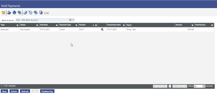 Click New to void, spoil, or reissue checks or EFTs. See Add Voided Payment for more information.