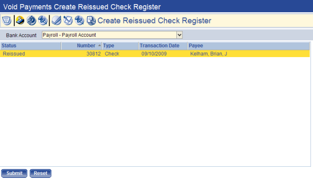 Overview: ClosedOn the Void Payments List page you can view payment information for the selected bank account. From this page, you can reissue a replacement check for the voided item or re-establish the underlying transaction that generated the payment. The update processing of the Void Payments page creates a journal of the appropriate transactions to reflect the changes made as a result of the void.
