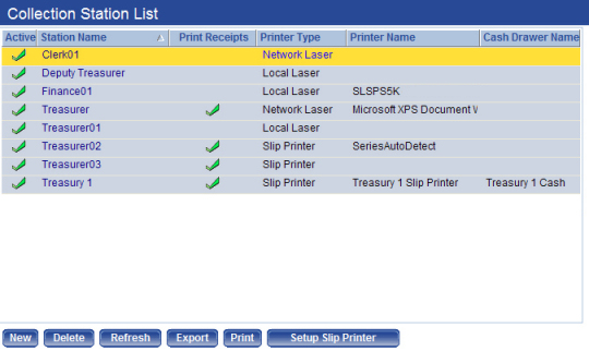 The Collection Station List page allows authorized users to view a list of collection stations. Collection Stations are devices in your organization that are used to record revenues collected. These stations can be set up to include a receipt printer and a cash drawer.