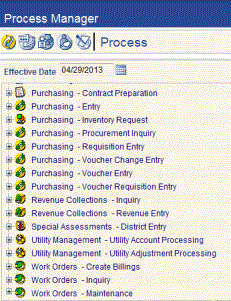Process Manager security controls apply to Special Assessments Billing Batch, Delinquent Batch, District Adjustment, District Entry, Inquiry and Transaction Adjustment. Select an area and click Set Up Departments to choose departments that users need access to.