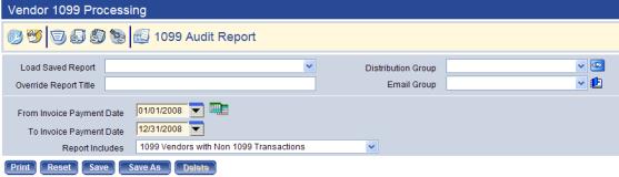 To access the page, go to Financial Management > Year-End Processing > Vendor 1099 Processing and click the 1099 Audit Report