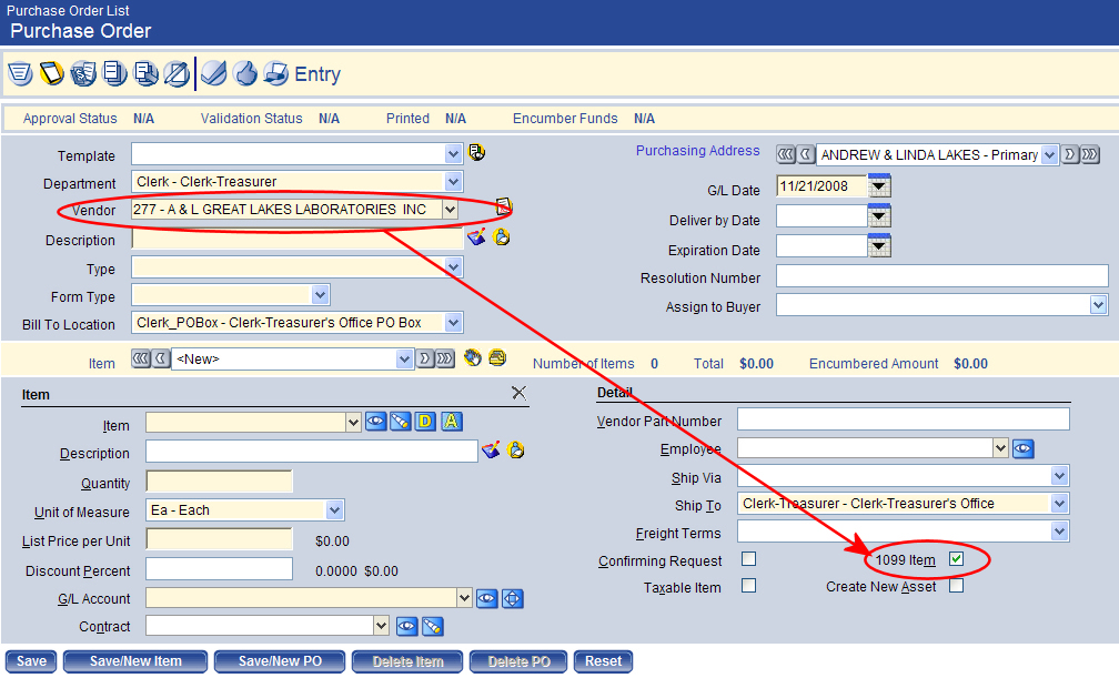 When you select a vendor that is marked as a 1099 vendor, the 1099 Item check box on the Purchase Order Entry screen is selected automatically. If the item should not be included in the vendor’s 1099, clear the 1099 Item check box.