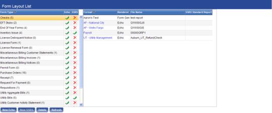 To open a particular form definition in edit mode, click the hyperlink in the Format column. To add a new Echo form, highlight the form type you want to add and click the New Echo button. To add a new SSRS form, highlight the form type you want to add and click the New SSRS button.