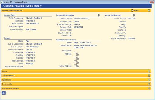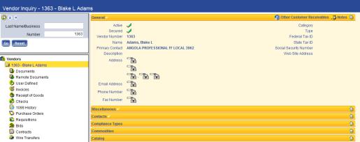 In some organizations, employees and potentially high-profile individuals such as elected officials are paid as vendors. Aside from the process of paying these vendors, the organization needs to be able to block the display of their contact (including bank account) information for their protection. The system allows field-level security to be applied to the vendor contact information.