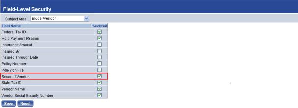 Select Vendor Contacts in the Subject Area field. Select the check box next to each piece of information that needs to be secured: