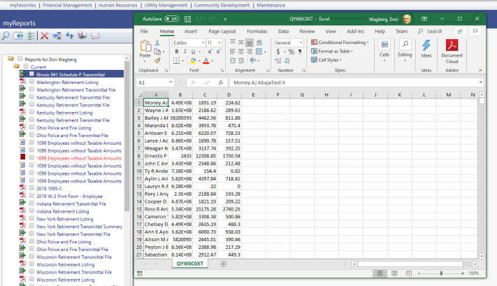After making your selections on this page, click Submit to generate the report and transmittal file. The report opens in a separate window and may be saved in a variety of formats or sent to myReports. The transmittal file is sent to myReports as an Excel file.