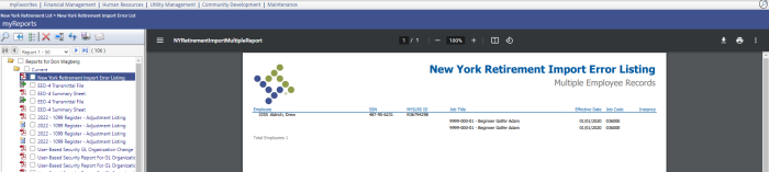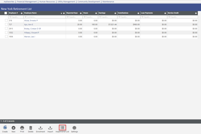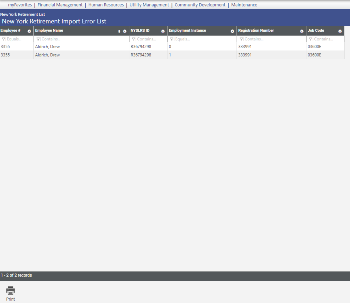 After you run an import, click this button to open the New York Retirement Report Error List page containing a grid of employees with multiple records: