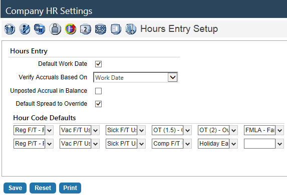 Hours Code Defaults Hours codes entered here are hard-coded into the corresponding column of the Hours Code Entry page. Any fields not defined on this page may be customized during hours code entry. |