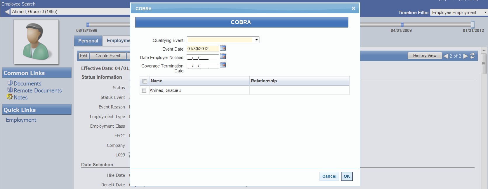 COBRA pop-up opens automatically, giving you the option to create a COBRA beneficiary. The Event Date on the pop-up defaults from the Termination Date on the Employment tab.