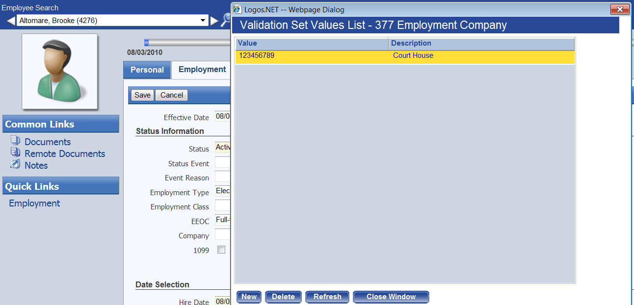 Identifies a company other than the one named in Company Suite Settings. This entry may refer to a pension company or some other company and has an Federal Employer Identification Number (FEIN) set up in validation set 377, Employment Company. The entry is used when W-2s are created for employees by company. To view, edit or add the FEIN values available for selection, hold down the <Shift> and <Ctrl> keys, and click once in the Company field. The Validation Set Values List-377 Employment Company pop-up opens. To add an FEIN to the Company drop-down selections, click the New button. To edit an FEIN or its description, click the hyperlinked Value (FEIN). |