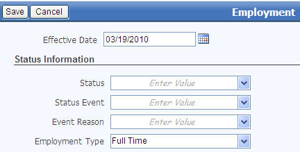 If you do not want to save your entries, click Cancel. If you are satisfied with your entries, click Save. The employment data updates, and the new effective date displays in the top-left corner of the section, immediately below the section header.