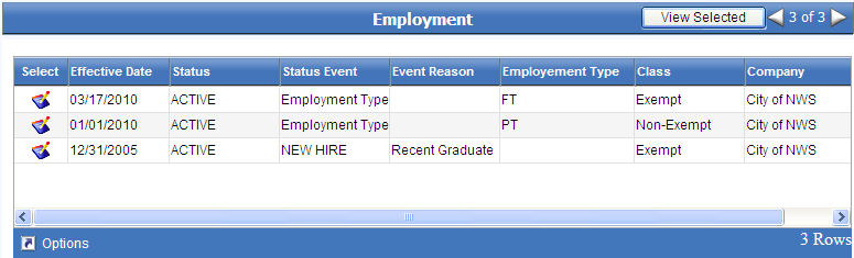 in the far-left cell of a grid row populates the Employment Detail section with the detailed data for that employment record in view mode. (The View Previous button changes to View History.)