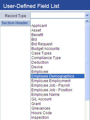 To create user-defined fields for the Demographics section, navigate to Maintenance > new world ERP Suite > Security > User-Defined Fields, and select Demographics from the Record Type drop-down.