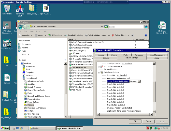 To stop this from occurring, the customer should go into each of their HP printers on the Application Server (Control Panel > Printers), find the Device Settings tab, and disable the Printer Status Notification setting. A screenshot of the setting is below: